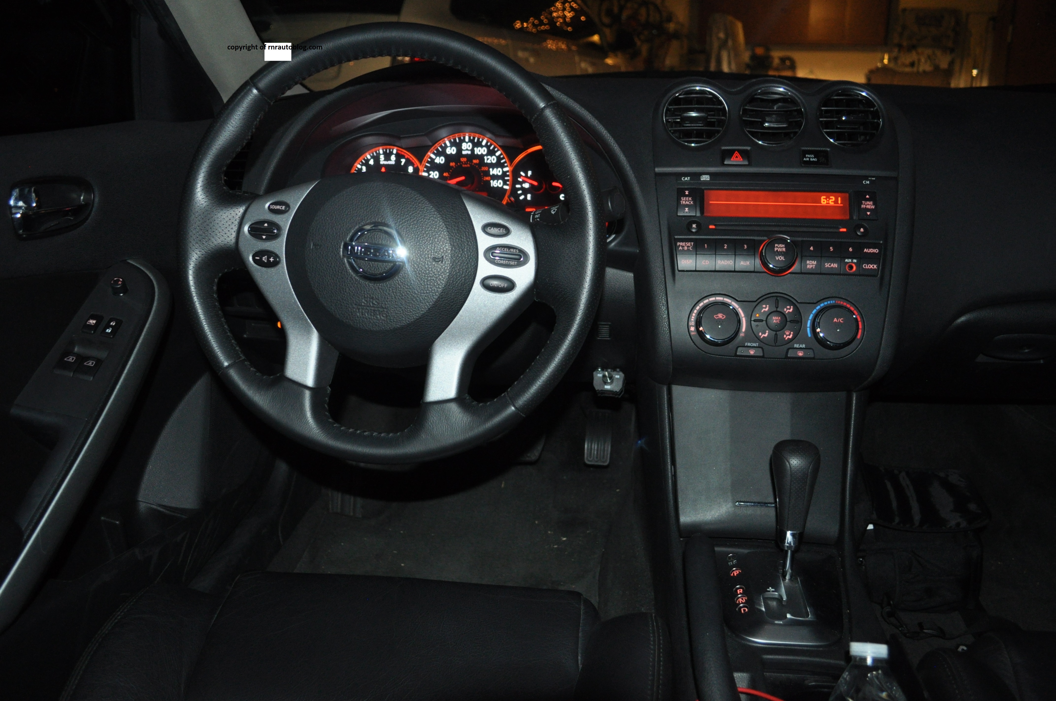 Styling wise, you can tell it is obviously an Altima. The front end is exactly the same as an Altima sedan. With that said, the frontal styling is clean with a touch of aggressiveness. Large and distinctive headlights flank out on the sides while the grille is somewhat disparate. Can’t say I care much for the sudden dip under the Nissan logo in the grille though. The side profile is pretty conventional. However, I remembered that the Nissan Altima V6 shares its mechanicals with the Infiniti G37 sedan and coupe. The one design detail that caught my eye was how the C pillar looks exactly like the Infiniti G37 coupe’s C pillar. As with the side profile, the rear styling is pretty ordinary. The spoiler nicely accentuates the trunk lid. The interior is carried over from the sedan as well. The dark color scheme is somber, but it is lifted by orange lighting.