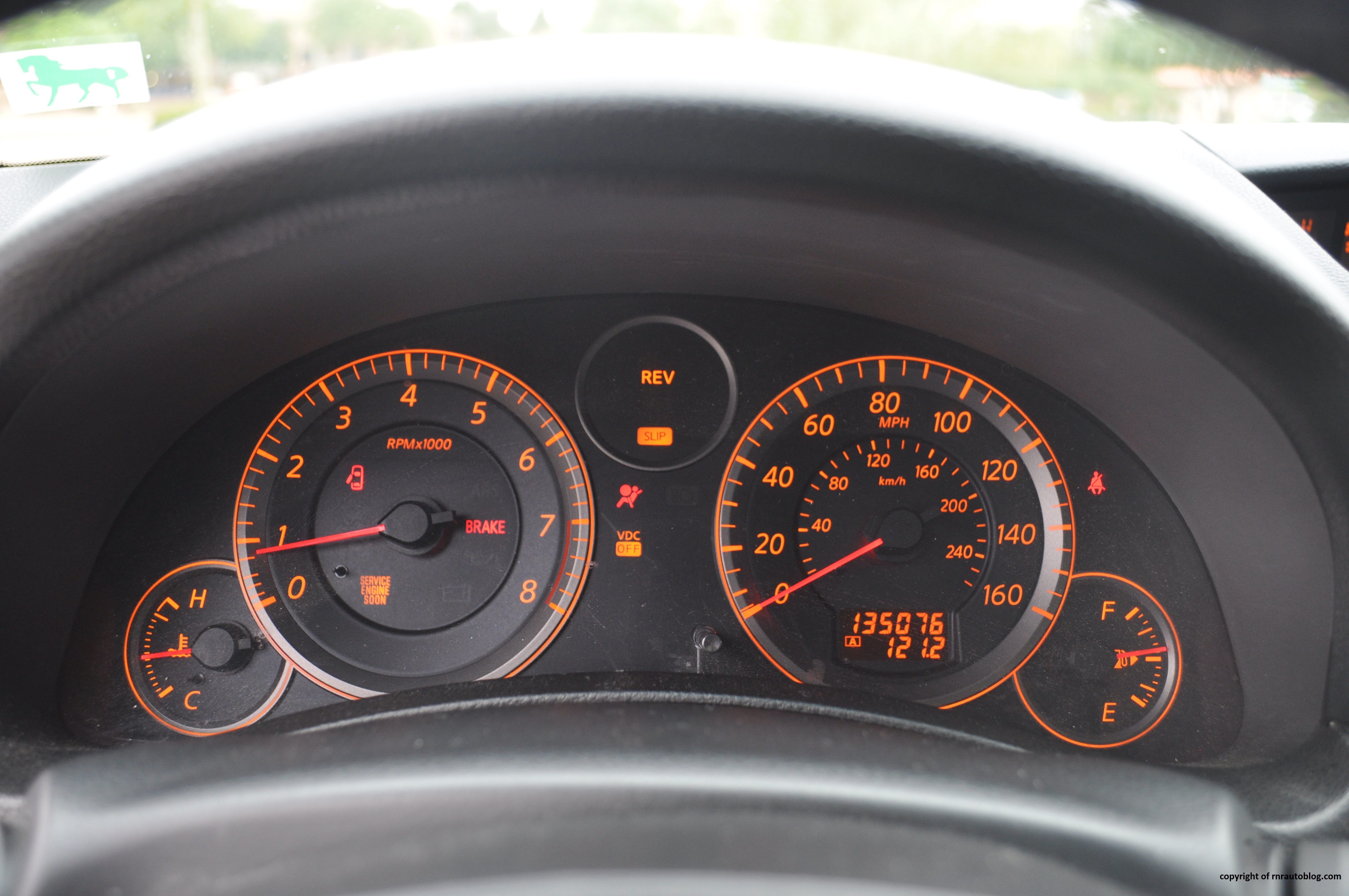 In contrast to the G20’s staid exterior, the G35 looks contemporary. The bug eye headlights and a tasteful chrome grille round off the nicely designed front. The only reservation I have with the front is the awkward bumper design. The plain side profile features classic rear wheel drive proportions: long hood and a short rear deck. I wish the door handles were body colored instead of chrome. As for the rear, the taillights caught my attention. They have a distinctive Japanese flavor to them, and the spoiler sets off the simplistic rear well. The interior has a businesslike and techy vibe to it, and the bright colored panels and orange lighting help offset an otherwise dark interior.