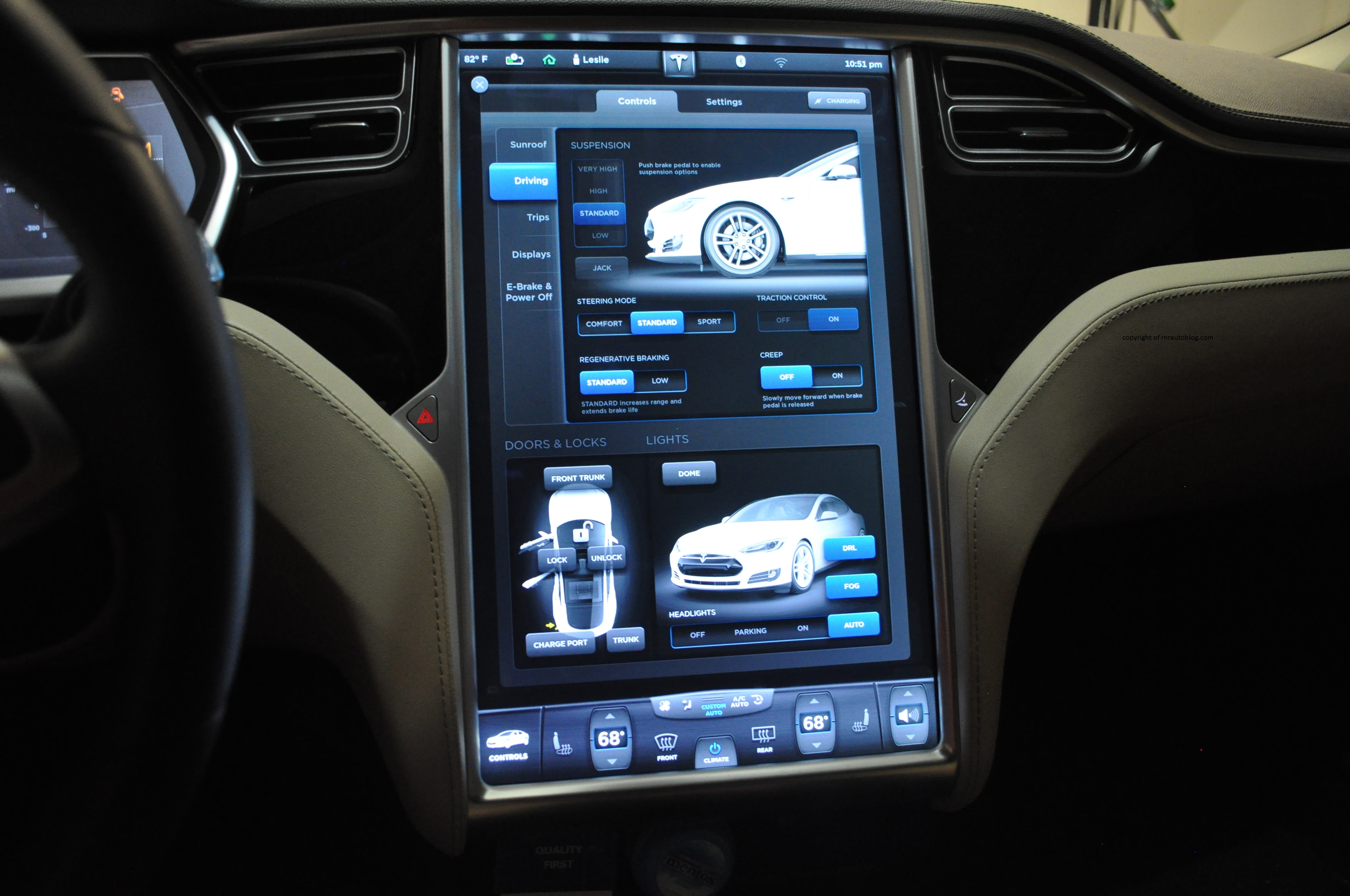 The Model S backs up its stellar design with the handling to match. Even though it is a big and heavy car, you would be hard pressed to tell from behind the wheel. Sure, the electric steering offers no feedback whatsoever, and the weighting feels artificial, but the handling is so good these flaws are easily forgivable. The weighting of the steering can be altered by selecting Standard, Comfort, or Sport. In Comfort mode, the steering felt even more artificial whereas in Sport mode, weight increases dramatically which I prefer, but Standard mode will suit most people. Without a heavy engine located on the front axle, the Tesla feels light on its feet and corners exceptionally well. There is an unofficial stereotype that electric cars are mundane to drive, but the Model S defies this perception. It feels like an actual car, and it drives better than many luxury sedans. Turn the stability control off, and it wags its tail eagerly. When pushed to its limits, the Tesla remained controllable and confident. The ride quality is superb as well considering its sporty behavior. It cossets the occupants from the bumps well, and on harsh roads, the road imperfections are muted.